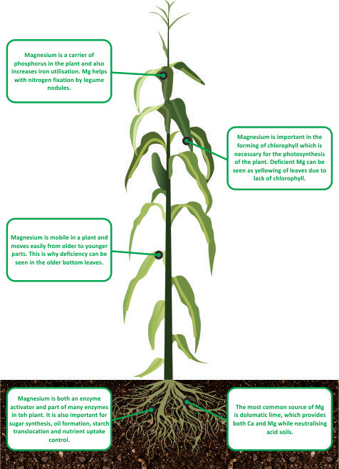 Magnesium nutrition of plants is frequently overlooked and shortages will adversely impact plant growth. Many essential plant functions require adequate Mg supplies, the most visible being magnesium’s role in root formation, chlorophyll and photosynthesis. Mg is required for crops to capture the sun’s energy for growth and reproduction. All crops require magnesium to capture the sun’s energy for growth and production through photosynthesis. Chlorophyll, the green pigment in plants, is the substance through which photosynthesis occurs. Without chlorophyll, plants couldn’t manufacture food.