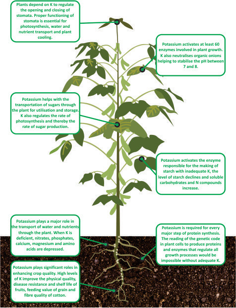 While potassium doesn’t constitute any plant structures or compounds, it plays a part in many important regulatory roles in the plant. It’s essential in nearly all processes needed to sustain plant growth and reproduction, including: